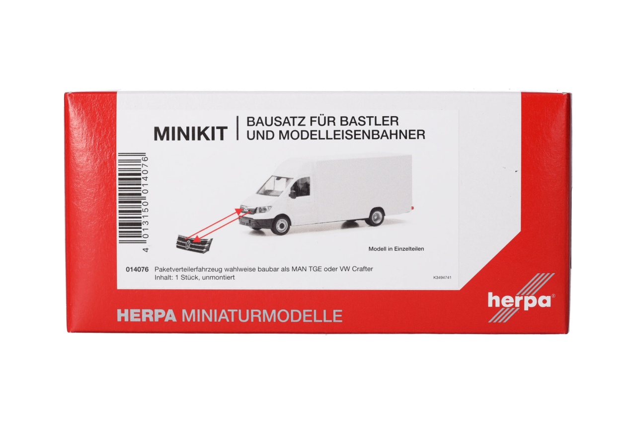 MiniKits sind original Herpa Modelle als Bausätze für Modelleisenbahner und Sammler. Mit dieser Packung können Sie ein Paketverteilerfahrzeug entweder als MAN TGE oder als VW Crafter zusammensetzen. MiniKits lassen sich aufgrund der Herpa Schnappbauweise mit wenigen Handgriffen ohne Kleber zusammenbauen (Montageanleitung liegt bei). So kann die Modellanlage preiswert mit Autos bestückt oder ein Autotransportzug günstig mit PKW beladen werden. Und Airbrusher können vor dem Zusammenbau die Karosserie in der eigenen Wunschfarbe lackieren.