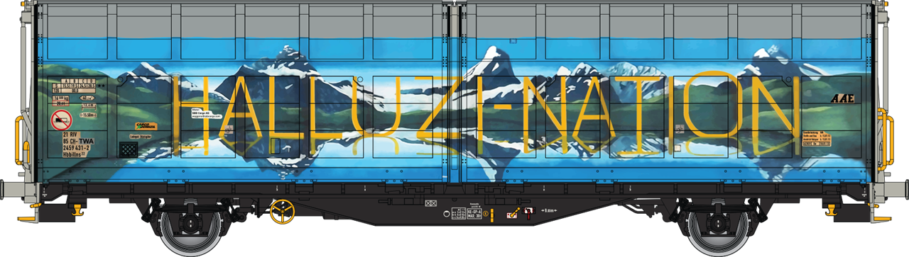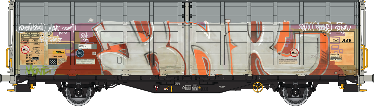 Sehr zum Ärger der Bahn werden jedes Jahr tausende Wagen und Triebfahrzeuge mit Graffitis überzogen – allerdings muss man aber auch zugeben, finden sich immer wieder auch Motive, die zum Schmunzeln oder auch Nachdenken anregen. Mit einer Serie von grossflächigen Motiven sind zahlreiche Schiebewandwagen der Bauart Hbbillns der SBB und TWA verziert worden.