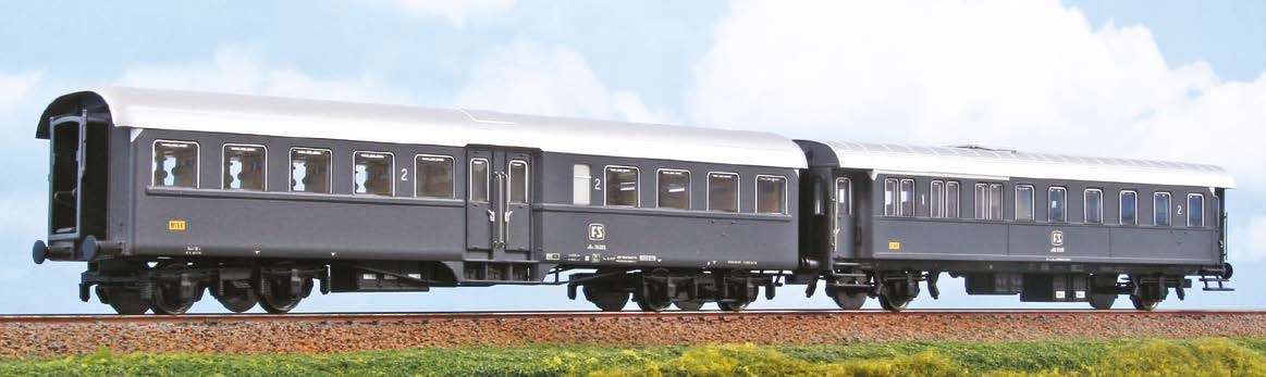 "Treno Navetta" der Italienischen Eisenbahn. Set bestehend aus einem Wagen Typ 1951R (nBz 38265) und einem Wagen Typ 1936 (nAB 65019) in schiefergrauer Lackierung.