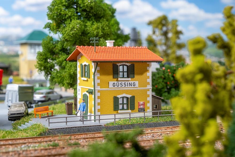 Wie der Bahnhof »Güssing« überzeugt auch dieses Bahnwärterhäuschen durch seine lebendige Farbgestaltung in spritzigem Gelb – ein echter Blickfang auf jeder Anlage. Sockel, Simse und Friese sind digital bedruckt und sorgen für weisse Akzente. Ideal, um der Modellbahnlandschaft einen neuen Anstrich zu verleihen.