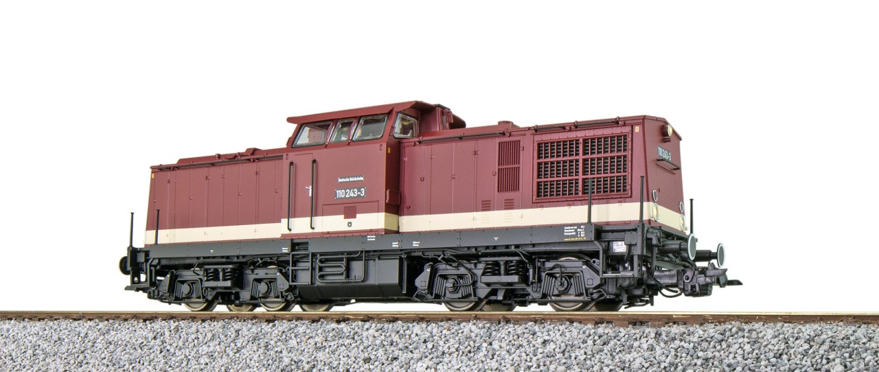 Die meistgebaute deutsche Streckendiesellokbaureihe darf als voll ausgestattetes H0-Modell natürlich nicht im ESU-Sortiment fehlen. Ausstattungsmerkmale ihrer DB-Schwester finden Sie auch hier. Dabei galt es aber die beiden im Original getrennt angesteuerten Fahrmotorlüfter auch im Modell unabhängig voneinander motorisch zu schalten. Durch die geätzten Lüfterabdeckungen lässt sich die Arbeit der Lüfterräder beobachten, akustisch unterstützt durch die entsprechenden Geräusche. Damit der knackige Sound des 12 KVD-Dieselmotors auch gut ins Gehör geht, versahen wir den Lautsprecher mit einem so genannten passiven Radiator und entwickelten eine den zur Verfügung stehenden Platz bestmöglich ausnutzende Schallkapsel. Dass ein soundsynchron arbeitender Raucherzeuger, ein Glockenankermotor mit Schwungmasse, Digitalkupplungen an beiden Enden, gefederte Puffer und viele Beleuchtungsfunktionen an Bord sind, versteht sich von selbst. Wie Sie es von ESU gewohnt sind, schauten wir auch bei der Gestaltung unserer Modelle genau beim Vorbild hin und setzten die Details mit minimalen Kompromissen um. Bei Loks mit Dampfheizkessel finden Sie die entsprechende Verrohrung, die Lüftergitter sind mehrteilig ausgeführt, die typischen Reflektoren der unteren Stirnlampen geben dem Modellauch bei ausgeschalteter Beleuchtung ein Gesicht. Natürlich lässt sich auch bei dieser V100 das magnetisch fixierte Dach des Führerstandes abheben und bei Bedarf die persönliche Ausrüstung des Lokpersonals weiter ergänzen. Besonders viele Details offenbaren das Fahrwerk gerade in der hellgrauen Lackierung nach TGL 1808. Tief gravierte und unterschiedlich ausgestattete Drehgestellblenden mit echten Federn und je nach Typ offene oder abgedeckte Bereiche unterhalb des Rahmens zeigen eindrucksvoll die Unterschiede innerhalb der Lokfamilie. Ausser bei der verkehrsroten Version liegen Reichsbahn-Schriftzug und Betriebsnummernschild als Ätzteile bei. Bei den im Vorbild langsameren 111 haben wir selbstverständlich nicht tumb nur die Höchstgeschwindigkeit reduziert, sondern alle für die Fahrdynamik relevanten CV angepasst.