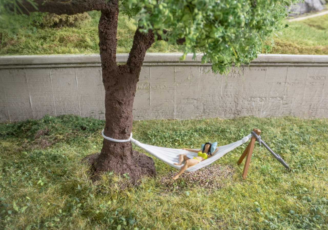 Zwischen einem hochwertigen, handgearbeiteten NOCH Master-Baum und einem filigranen, 3D-gedruckten Ständer spannt eine Hängematte, in der eine Frau im Bikini schläft. Sie scheint beim Lesen eingeschlafen zu sein, ein offenes Buch liegt auf ihrem Bein. Ein lebendiges, detailreiches Motiv, das Ruhe, Lebensfreude und Bewegung in jede Modell-Landschaft bringt.