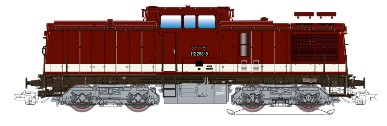 Vorbild: Die Deutsche Reichsbahn der DDR verzichtete bei der Aufstellung des Diesellok-Typenprogramms in den 1950er-Jahren auf eine Streckendiesellok mittlerer Leistung zwischen der V 60 und der V 180. Als dann der Bedarf Anfang der 1960er-Jahre doch akut wurde, entwickelten der VEB Lokomotivbau «Karl Marx» und die Elektrotechnischen Werke «Hans Beimler» unter der Massgabe, möglichst viele Baugruppen der V 60 und V 180 zu verwenden, die V 100, wobei die 100 für die Leistung von etwa 1000 PS stand. Die Höchstgeschwindigkeit der ab 1969 als Baureihe 110 bezeichneten Loks betrug 100 km/h. Nach eingehenden Tests startete bereits im Folgejahr die Serienfertigung. In mehreren Serien entstanden insgesamt 869 Maschinen. Während man bei den ersten Bauserien die Verrohrung des Rahmens mit Blechen verkleidete, sparte man diese zugunsten des geringeren Gewichts und für vereinfachte Wartung bei späteren Serien ein. Durch Fortschritte in der Motorenentwicklung und durch Einbau einer Ladeluftkühlung, liessen sich Leistung und Zuverlässigkeit des 12KVD-Typs verbessern. Die letzte Ausbaustufe des 12-KVD-Motors stellte man auf 1100 kW ein, mithin fast 400 kW mehr, als in den ersten Bauserien. Nachdem sich bei anderen Baureihen der DR graue Drehgestelle zur besseren Erkennung von Schäden bewährt hatten, erhielten ab etwa 1978 anlässlich von Revisionen auch Drehgestelle und Tanks der V 100 eine graue Farbgebung. Ab 1992 erhielten DR-Dieselloks analog zu DB-Loks mit einer 2 beginnende Loknummern. Manche Bw klebten die Ziffern wie gehabt auf schwarze Metallschilder, so geschehen beispielsweise bei 112 268, die nach der Umzeichnung 202 268 hiess. Darum legen wir unserem Modell der 112 268 auch noch Ätzschilder als 202 268 bei. Für den Export unter anderen nach China leitete LEW aus der V 100 die für den schweren Rangierdienst vorgesehene Unterbaureihe V100.3 mit einer Höchstgeschwindigkeit von nur 65 km/h ab. Die für die DR und Werkbahnen in der DDR aus der V 100.3 abgeleitete Version hiess V 100.4. Da das Getriebe der 111 im schweren Rangierdienst nicht vollends überzeugte, blieb es bei 37 Exemplaren bei der DR und weiteren sechs für die DDR-Industrie. Zur Beschleunigung des Rangierdienstes baute man 1978 zwei 110 testweise Strömungswendegetriebe ein. Die positiven Erfahrungen mit den als Baureihe 108 bezeichneten Maschinen mündeten erst 1991 im Umbau von insgesamt 82 Loks der Ursprungsbaureihen 110 und 111 zur Baureihe 298.
