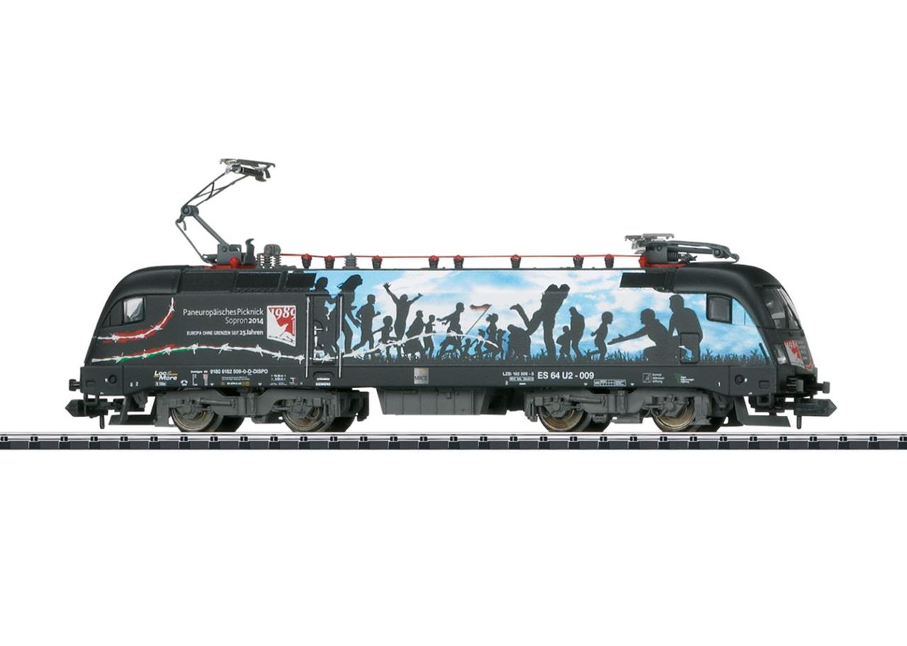 Der Taurus Nr. ES 64 U2-009 der MRCE (Mitsui Rail Capital Europe) GmbH fährt mit der zum Anlass des 25-jährigen Jubiläums des Paneuropäschen Pickniks gestalteten Dekoration seit dem 30. Juni 2014. Die Lokomotive ist in Österreich und Deutschland zu sehen (derzeit zieht sie die Personenzüge der DB zwischen Berlin und Hamburg). Die gleiche Lokomotive der GYSEV/Raaberbahn AG (Betriebsnr. 91 43 0470 505-8) wurde am 18. August 2014 in Sopron präsentiert. Seitdem zieht sie Personen- und Güterzüge in Ungarn und in Österreich. So haben wir unseren Plan verwirklicht: die Botschaft des Jubiläums durch das gleiche Motiv auf den Lokomotiven in allen drei, in dem historischen Prozess beteiligten, Ländern (in Ungarn, Österreich und Deutschland) zu tragen - EUROPA OHNE GRENZEN. Diese historischen Ereignisse haben mit dem Paneuropäischen Picknick angefangen, sich mit dem Fall der Berliner Mauer und der Wiedervereinigung Deutschlands fortgesetzt. Das Lokdekorationsprojekt hat sich aus der Initiative der Loc&More GmbH und nach ihren Plänen (Grafiker: Péter Tranta) verwirklicht. Die Kosten des Projektes wurden von der GYSEV AG und der Loc&More GmbH getragen - mit der Unterstützung der Konrad Adenauer Stiftung und der Stiftung für ein Bürgerliches Ungarn (PMA). Was ist das Paneuropäisches Picknick? Eine gute Zusammensetzung der Ereignisse ist auf der Homepage des Paneuropäischen Picknicks zu lesen: http://www.paneuropaipiknik.hu/index.php?site=30 Der Autor ist Dr. Imre Tóth, Historiker, Direktor des Museums Sopron. Vorstellung der Lokdekoration Im Motiv erscheint das bereits zum 20. Jubiläum des Picknicks entworfene Logo, dieses Mal in silberner Farbe - dem 25-Jahre Jubiläum entsprechend. Auf dem Zug zu sehen sind etwa ein Drahtzaun-Motiv in österreichischen sowie ungarischen Farben stellvertretend für die Grenze zwischen Ungarn und Österreich. Die DDR-Bürger brechen aus der Dunkelheit der kommunistischen Ära, durchreissen den Stacheldraht, kommen auf das Licht der Freiheit und vereinigen sich mit Ihren Verwandten und Landesleuten. Das Motiv auf der anderen Seite der Lokomotive erzählt nicht mehr die persönliche Geschichte der deutschen Flüchtlinge, sondern stellt die historischen Ereignisse dar, die mit dem Paneuropäischen Picknick angefangen haben. Der durchrissene Stacheldraht, die Häuser von Sopron, der Feuerturm als Wahrzeichen der Stadt, ein zurückgelassener Trabi, ein Wachturm und so kommen wir zur Berliner Mauer, zum Brandenburger Tor. Der Himmel darüber ist in den Farben der drei beteiligten Länder gestaltet. Beide Seiten und die Fronten der Lokomotiven sind mit Aufschriften in den Sprachen der beteiligten Länder ergänzt. Sie übergeben die wichtigste Botschaft: EUROPA OHNE GRENZEN - seit 25 Jahren. (Quelle: http://www.locandmore.eu).