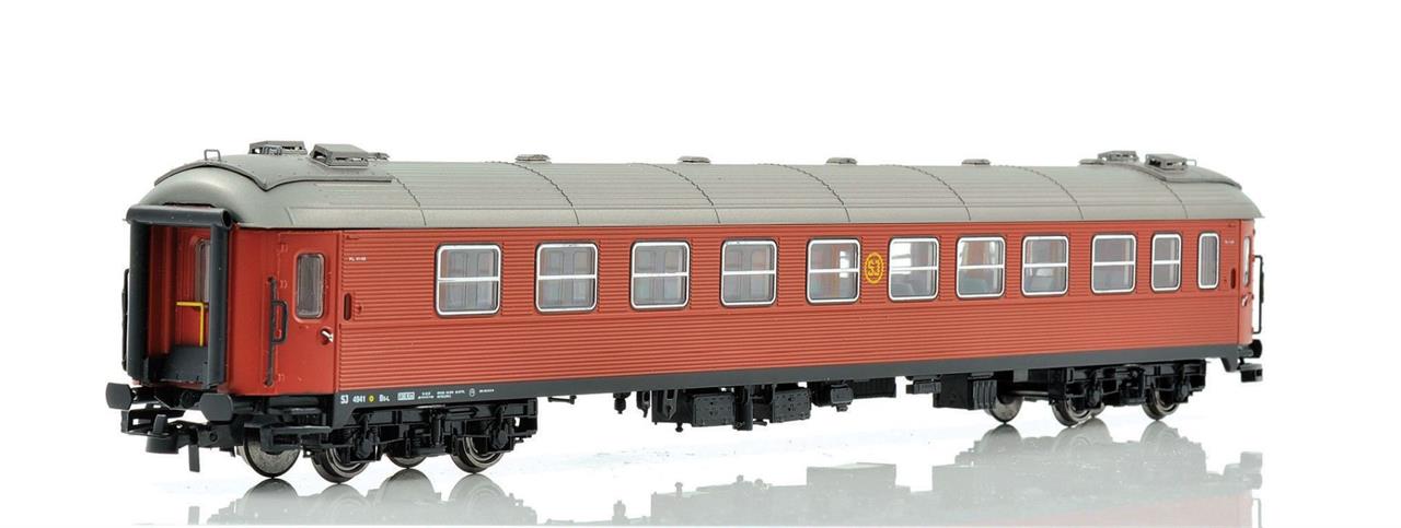 NMJ Topline B5 Personenwagen im braunen klassischen SJ Design mit mit rundem gelben SJ Logo nach 1970. Ein perfekt detailliertes Model mit allen Details am Wagenkasten, Dach , Rahmen und Untergestell. Komplett farbig bemalte Inneneinrichtung mit Abteilen separat montierte Sitze, Gepäckablage und Abteilwände. Korrekte Drehgestelle mit NEM Kurzkupplungskulisse. Insgesamt 65 Ao2 Wagen wurden zwischen 1963-1968 gebaut. Die Wagen hatten zwei 1.Kl Salonabteile und zwei 1.Kl Abteile. Die Wagen waren bis 2006 im braunen Design im Einsatz. Total wurden 514 Wagen der 1960er Wagen gebaut. Im einzelnen waren es folgende Bauarten : A2 65 Stück, AB2 35 Stück, AB3 78 Stück, B1 100 Stück, B5/B5b 145 Stück, R2 25 Stück, RB2 21 Stück, følgende vogntyper: A2 65 stk, AB2 35 stk, AB3 78 stk, B1 100 stk, B5/B5b 145 stk, R2 25 stk, RB2 21stk, WLAB1, DF28 20 Stück NMJ bietet folgende Varianten an, A2, AB2, AB3, B1 und B5. Braune Loks und braune Wagen waren das Symbol für die schwedische Eisenbahn im Inn- und Ausland. Alle Wagen wurden in braun mit schwarzen Rahmen lackiert. Am Anfang waren die Dächer silbern, später Hell-und dunkelgrau und schwarz lackiert. Zunächst hatten die Wagen ein gelb/braun/weisses rundes SJ Logo. der sogenannte Fleischstempel. Später bekamen sie das neue weisse quadratische SJ Logo, Briefmarke genannt.