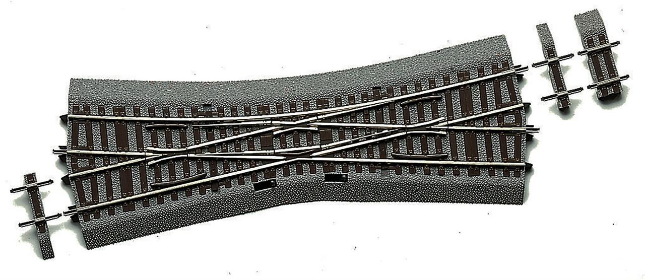 mit innenliegenden Zungen. Abzweigradius 531 mm, Kreuzungswinkel 15°. Für den Diagonaleinbau liegen zwei D4 und ein D12 bei. Mit Bettung.