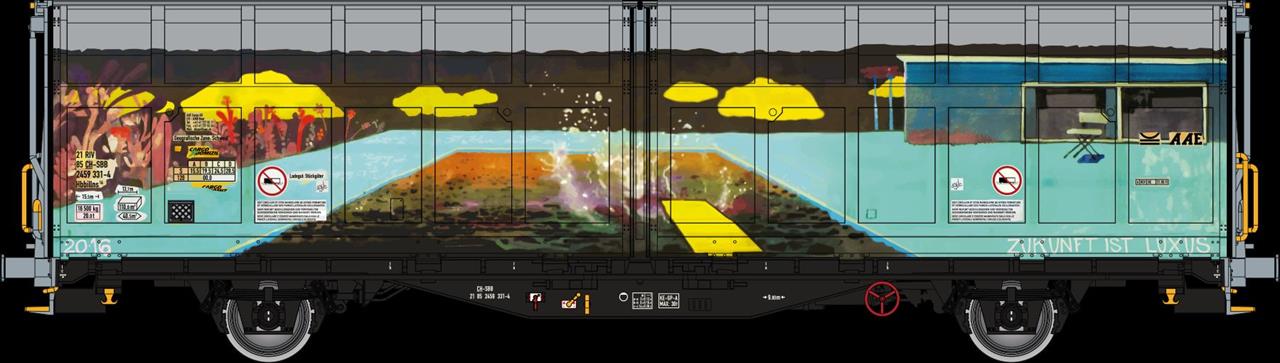 Sehr zum Ärger der Bahn werden jedes Jahr tausende Wagen und Triebfahrzeuge mit Graffitis überzogen – allerdings muss man aber auch zugeben, finden sich immer wieder auch Motive, die zum Schmunzeln oder auch Nachdenken anregen. Mit einer Serie von grossflächigen Motiven sind zahlreiche Schiebewandwagen der Bauart Hbbillns der SBB und TWA verziert worden. Mit der Serie «Zukunft ist Luxus» entstanden verschiedene Motive rund um den Kapitalismus, Flüchtlingskrise und sogenannten First World Problems. Beim Besprühen der «Wholecars» werden bewusst alle Anschriftenfelder vom Künstler frei gelassen, damit steigt nämlich die Chance, dass das Graffiti nicht entfernt wird.