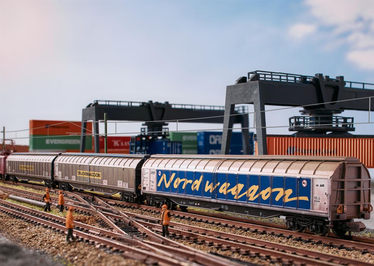Vorbild: Set mit drei 4-achsigen Schiebewandwagen Habins 12. Privatwagen der Firma Transwaggon GmbH, Hamburg, eingestellt bei der Deutschen Bahn AG (DB AG). Mit starken Alterungsspuren. Betriebszustand um 2004.