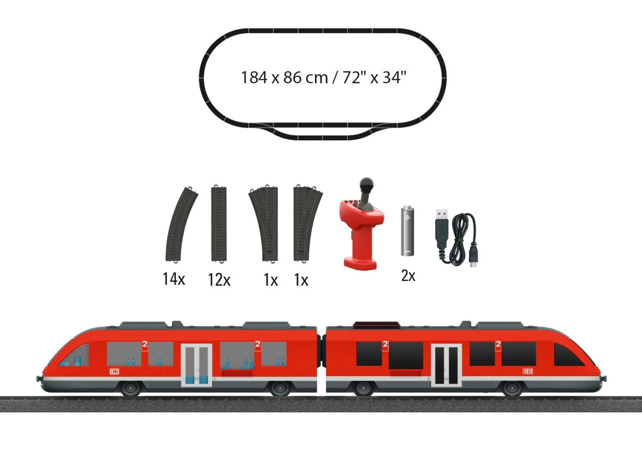 Modell: Zug mit Akkuantrieb und Magnetkupplungen zwischen den beiden Zugteilen. Motor, Akku und die gesamte Elektronik sind im motorisierten Zugteil für Kinder unzugänglich verbaut. Der Zug kann mit dem mitgelieferten Ladekabel aufgeladen werden. Der zweite Zugteil sorgt durch das abnehmbare Dach und die Inneneinrichtung für vielerlei Spielmöglichkeiten. Jeweils 3 Geschwindigkeitsstufen bei Vorwärts- und Rückwärtsfahrt, sowie 3 Soundfunktionen und ein Zweilicht-Spitzensignal, sind über das kindgerechte Infrarot-Fahrgerät steuerbar. Länge des Zuges 32,6 cm. Inhalt: 16 gebogene Kunststoffgleise, 10 gerade Gleise, 1 Weiche links und 1 Weiche rechts. Kindgerechter, kabelloser Märklin Power Control Stick. Ladekabel und 2x AAA Batterien im Lieferumfang enthalten. Zudem liegt ein Stickerbogen mit verschiedenen ausländischen Bahngesellschaften zum Bekleben des Zuges bei. Erweiterbar mit der Kunststoffgleis-Ergänzungspackung 23400.