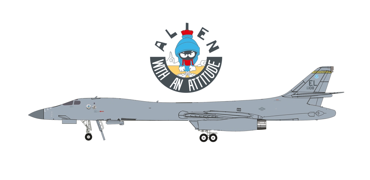 Turnusmässig werden strategische Bomber von den USA ins Ausland verlegt, um Präsenz zu zeigen und die Zusammenarbeit mit den Luftwaffen verbündeter Länder zu üben. Eine solche Basis befindet auch auf der pazifischen Insel Guam, auf der die US-Luftwaffe mit der Andersen Air Force Base einen strategisch wichtigen Stützpunkt unterhält. 2024 wurden auch vier B-1 Lancer der 37. Staffel aus Ellsworth in South Dakota, darunter auch das Vorbild dieser Neuheit in 1:200, auf dem auch, wie bei Bomber-Crews beliebt, auch ein Nose Art aufgemalt wurde. In diesem Fall erinnert der abgebildete und schlecht gelaunte Ausserirdische wohl nicht zufällig an Marvin den Marsmensch aus den beliebten Cartoons um Bugs Bunny. Auch bei dieser neuesten Auflage der B-1 sind die Tragflächen schwenkbar. Zudem liegt die Einstiegsluke mit herausgefahrener Treppe bei.