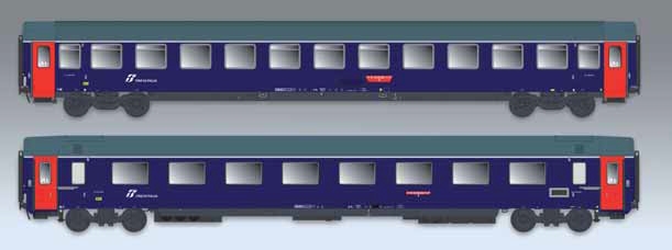 Set mit zwei Wagen 2. Klasse Typ UIC-Z und GC in InterCity Notte-Lackierung, gekennzeichnet durch das Fehlen des roten Bandes.