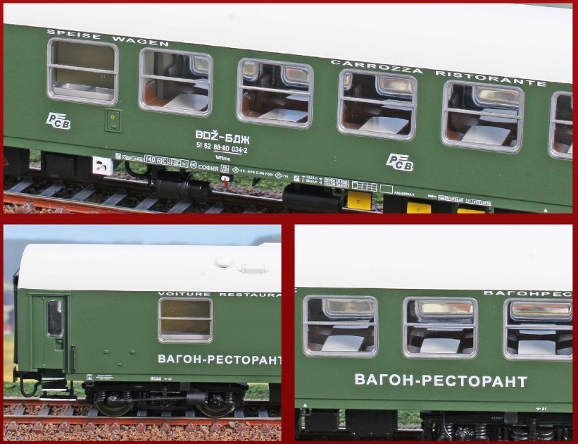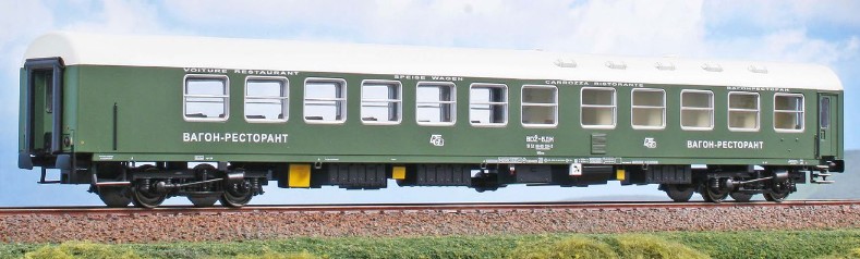 Speisewagen WRme der Bulgarischen Eisenbahn, in grüner Lackierung.