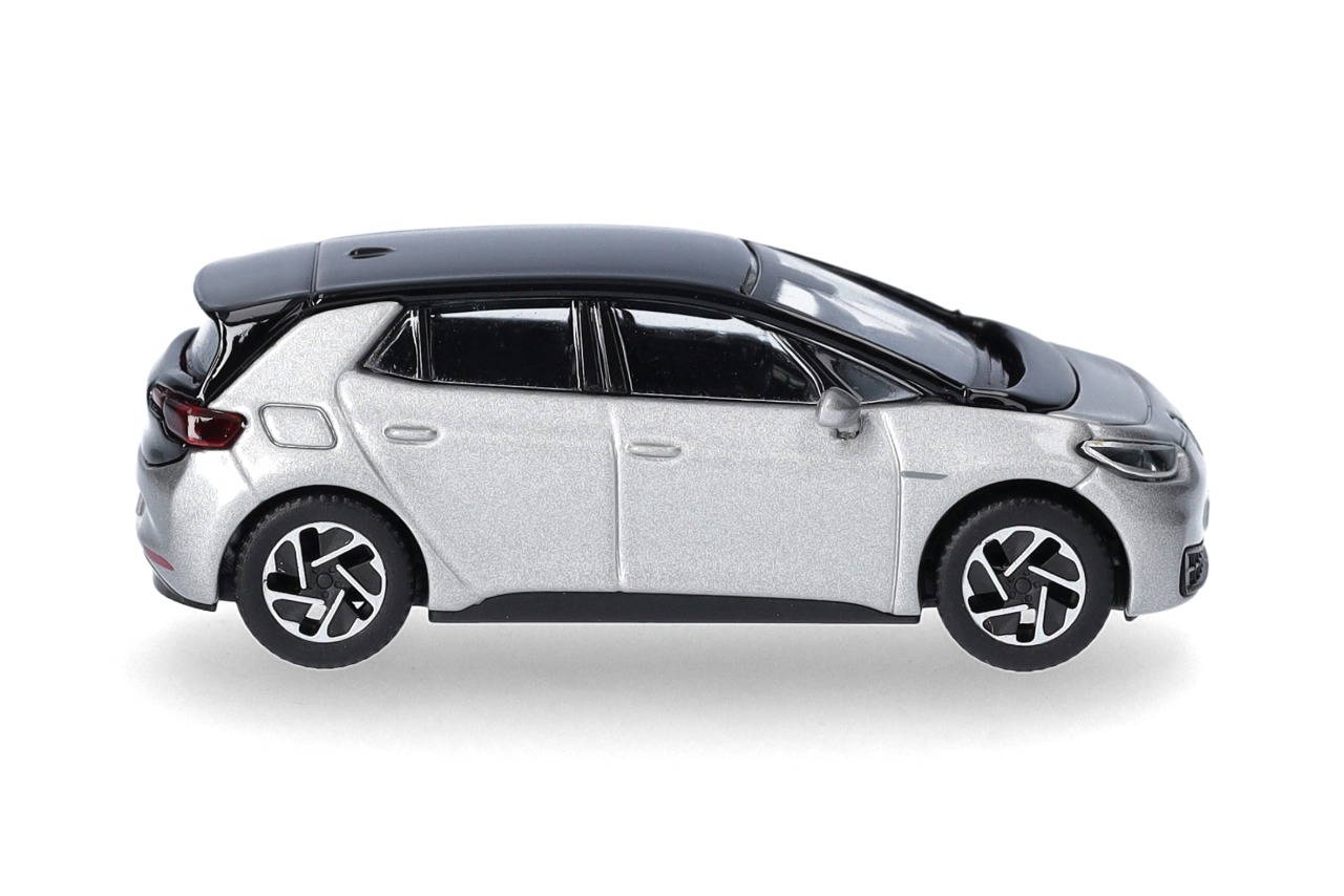Der elektrisch betriebene VW ID.3 wird ab März 2026 in der Farbgebung scale silver metallic mit schwarzem Dach das Herpa-Programm ergänzen.