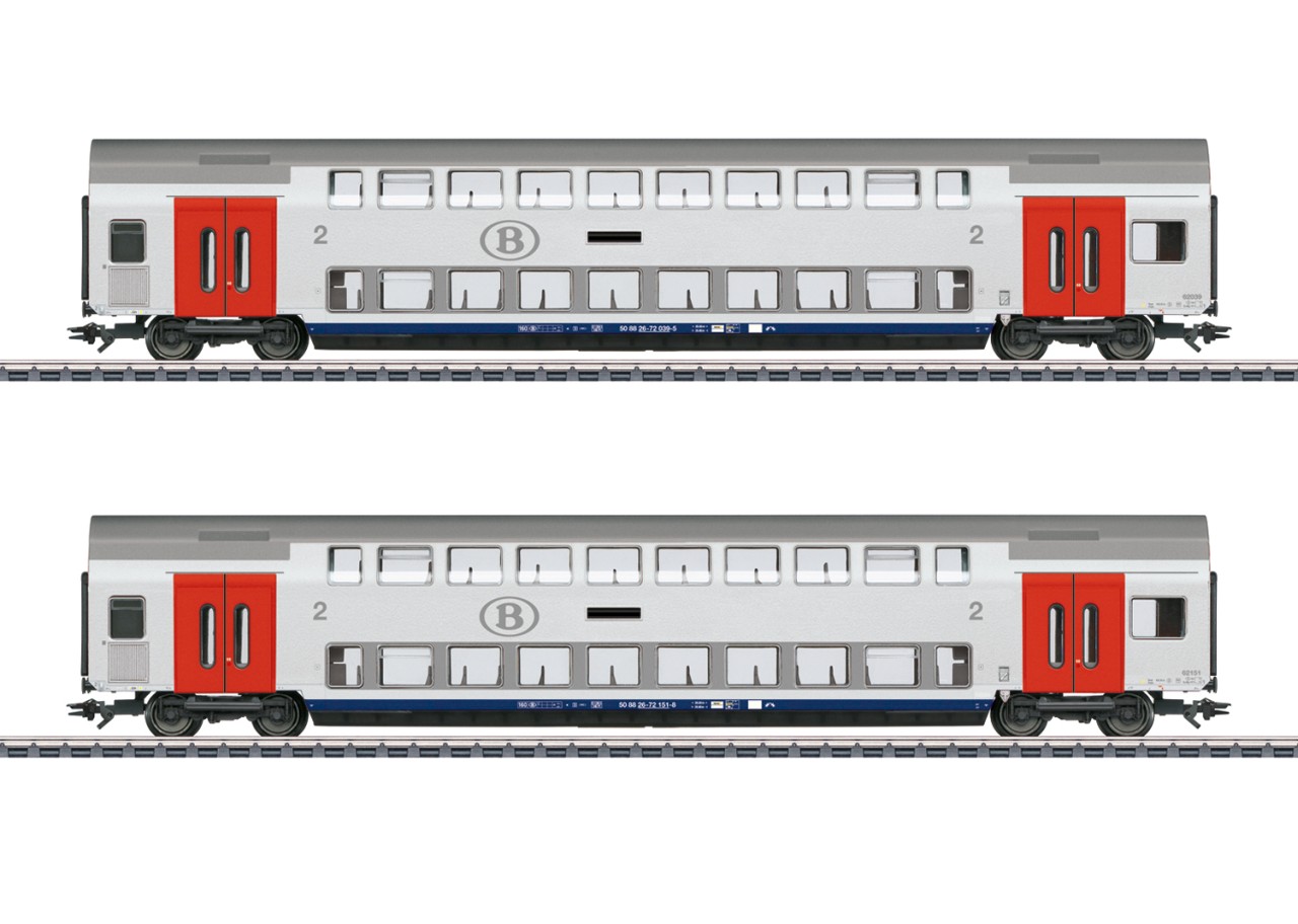 Vorbild: Zwei Doppelstockwagen Bauart M6, 2. Klasse, der SNCB. Lichtgraue Grundfarbgebung. Betriebszustand ab 2023.