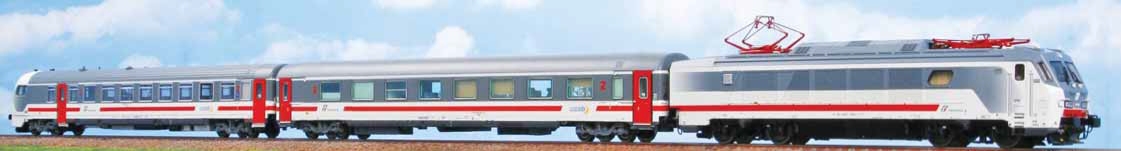 Set bestehend aus einer E.401-Lokomotive, einem BRH- Multiservice-Wagen und einem UIC-Z-Lehrwagen mit modifizierter Front, in der "intercity Day"-Lackierung mit dunklem Band an den Fenstern.