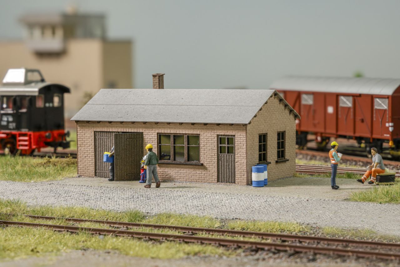 Der Geräteschuppen darf in keinem Bahnbetriebswerk fehlen, macht sich aber auch gut auf jedem Firmenhof oder als kleine Schrauber-Werkstatt in Gewerbe- und Mischgebieten. Dem Laser-Cut Modellbausatz liegt eine Bauanleitung und passender Kleber bei.