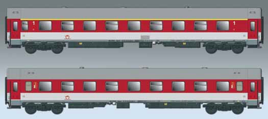 Set bestehend aus einem Apeer 19-70-Wagen der 1. Klasse und einem Bpeer 29-70-Wagen der 2. Klasse in aktueller ZSSK-Lackierung.