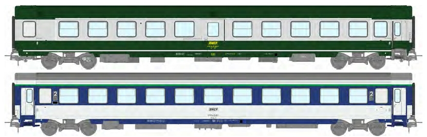 • Corail VU Liegewagen B10c10x in TEN-blau/weiss, "Encadré"-Logo, werkseitig mit sichtbaren Drehgestellfedern ausgestattet