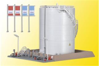 Bausatz. Die MIRO Mineralölanlage von kibri ist so konzipiert, dass sie sich aus einzelnen Bausteinen individuell zusammenstellen lässt. So lassen sich die Anlagenteile problemlos in jede beliebige Modellbahnanlage einpassen. Der angelieferte Treibstoff (z. B. leichtflüchtiges Benzin oder Rohöl) wird zur Zwischenlagerung in diesem Hochtank und den Tanks der Tankanlage Art. 39832 gelagert, bevor er an der Abfüllstation Art. 39834 in den SCANIA Tankwagen gefüllt und von dort zu den Verbrauchern transportiert wird. Wie beim Vorbild steht der Tank auf einer undurchlässigen Lehmschicht und ist zum Schutz des Erdreichs von betonierten Wällen umgeben. Ein filigran umlaufender Treppenaufgang führt zur oberen Plattform. Masse: L 18 x B 14 x H 14 cm. Schwierigkeitsgrad: 2 (Fortgeschrittene).