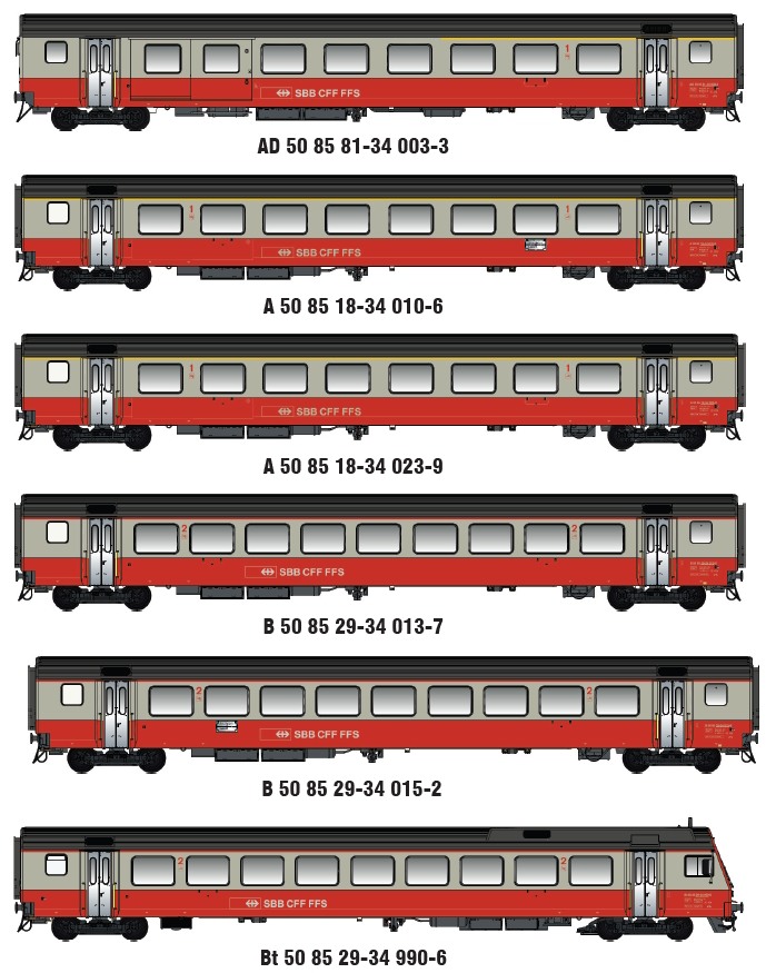 Steuerwagen mit detaillierter Nachbildung und separater Beleuchtung des Führerraums. Eingesetzte Scheibenwischer und Rückspiegel. Anstelle des montierten Bahnräumers mit Nachbildung der Bremsschläuche kann ein offener Bahnräumer und Normkupplungsschacht eingebaut werden; danach ist es möglich, eine Lokomotive vor den Steuerwagen zu spannen bzw. Zusatzwagen anzuhängen. Lichtwechsel weiss/rot über Polarität bzw. Funktionsdecoder gesteuert. Unterschiedliche Dachantennen je nach Epoche. Dachklimaanlagen mit eingesetzten Metallgittern aus Ätzblech. Modelle mit Innenbeleuchtung.