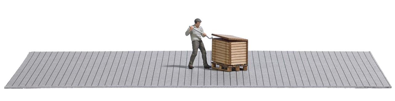 Arbeiter, der mit einem Nageleisen eine Holzkiste aufstemmt. Mit Kiste aus echtem Holz und Gehweg-Dekorplatte, Grösse 148 x 105 mm.