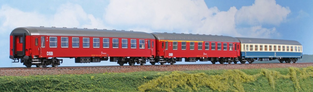 Set Nord West Express 236/237 "Hoek van Holland – København – Helsingør", bestehend aus einem 1./2.-Klasse-DSB-Wagen, einem 2-Klasse-DSB-Wagen und einem Bcm 246-DB-Liegewagen.
