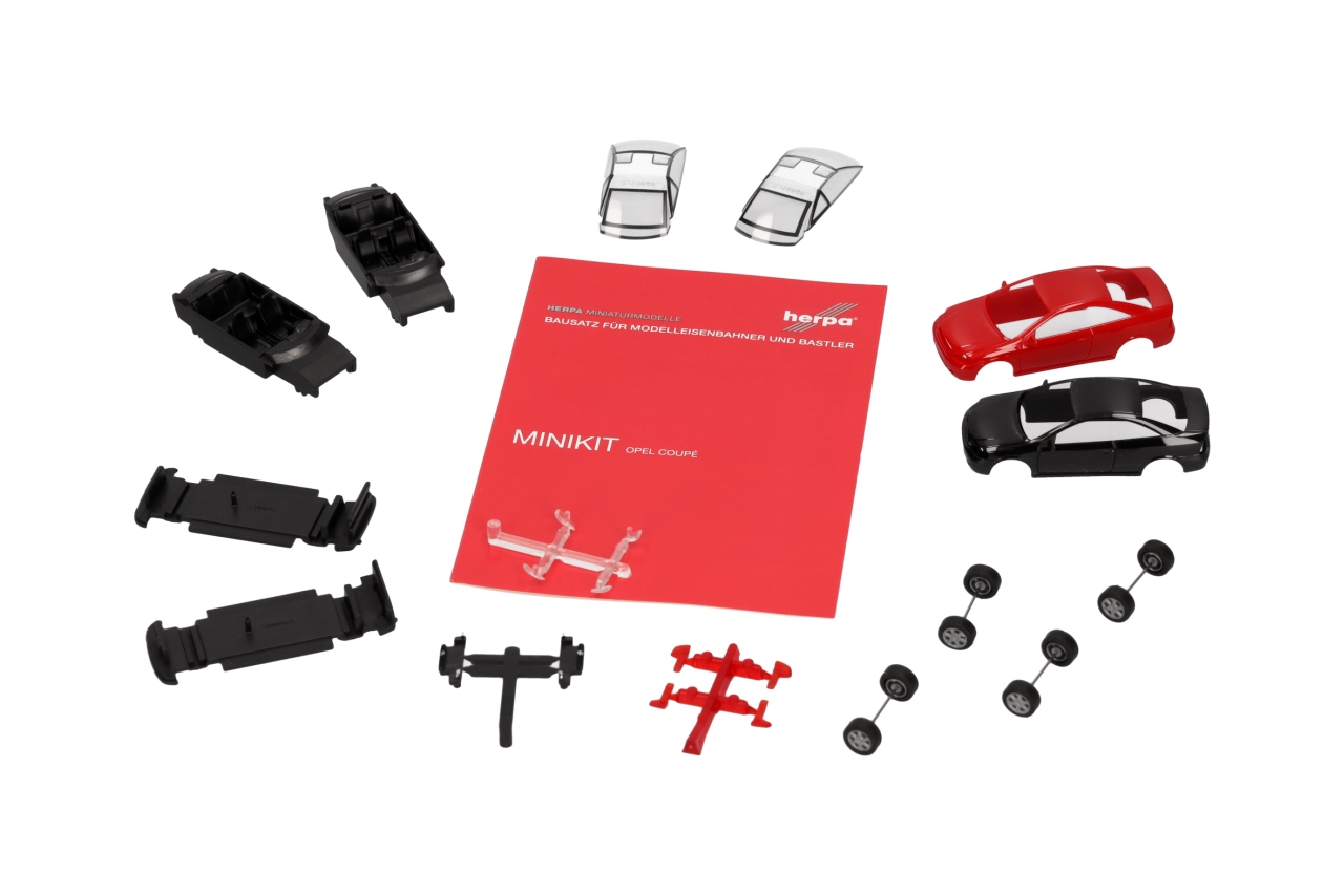 MiniKits sind original Herpa Modelle als Bausätze für Modelleisenbahner und Sammler. Der Opel Coupé (2000) ist ein neues Modell im Bereich der MiniKits und erscheint zunächst in schwarz und magmarot. MiniKits lassen sich aufgrund der Herpa Schnappbauweise mit wenigen Handgriffen ohne Kleber zusammenbauen (Montageanleitung liegt bei). So kann die Modellanlage preiswert mit Autos bestückt oder ein Autotransportzug günstig mit PKW beladen werden. Und Airbrusher können vor dem Zusammenbau die Karosserie in der eigenen Wunschfarbe lackieren.