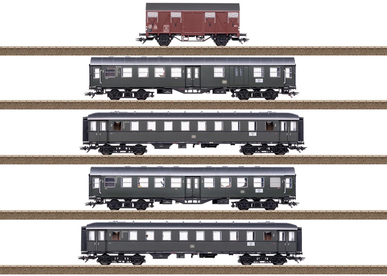 Vorbild: Ein Güterwagen und vier Reisezugwagen unterschiedlicher Bauart der Deutschen Bundesbahn (DB). Ein gedeckter Güterwagen Gmms 44, ein vierachsiger Umbauwagen 2. Klasse mit Gepäckraum BD4yge, zwei vierachsiger Reisezugwagen 2. Klasse B4ye der Einheitsbauart und ein vierachsiger Umbauwagen 2. Klasse B4yge. Zuglauf: Frankfurt [M] – Giessen – Marburg – Biedenkopf – Siegen – Troisdorf – Köln. Reisezugwagen in flaschengrüner Grundfarbgebung. Gmms 44 in Rotbraun.