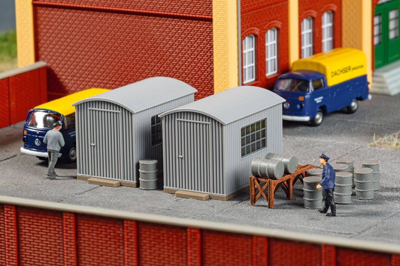 Zwei Wellblechhütten in typischer Bauform, wie sie als Öllager auf Werksgeländen oder in Bahnbereichen verwendet wurden. Zum Zubehör gehören eine Rampe aus stabilem Karton in Lasercut-Technologie sowie mehrere Fässer zur Ausgestaltung. Die Schuppen lassen sich flexibel platzieren und sind vielseitig einsetzbar.