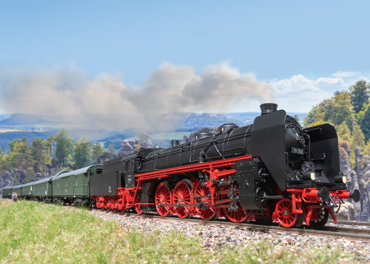Vorbild: Schnellzug-Dampflokomotive Baureihe 19.0 Sachsenstolz (Sächsische Gattung XX HV), mit sächsischem Kohlen-Schlepptender 2´2 T31. Deutsche Reichsbahn der DDR (DR/DDR). Mit grossen Windleitblechen. Lok-Betriebsnummer 19 016. Betriebszustand Epoche IIIa, Anfang der 1950er Jahre.