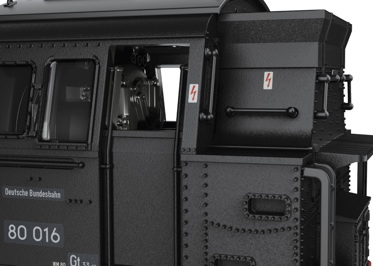Vorbild: Tenderlokomotive Baureihe 80 der Deutschen Bundesbahn. Ausführung mit drei Kesselaufbauten, Läutewerk und Turbodynamo links, Rauchkammertüre ohne Zentralverschluss mit Nummernschild mittig. Tiefschwarze Grundfarbgebung. Betriebsnummer 80 016. Betriebszustand um 1953.