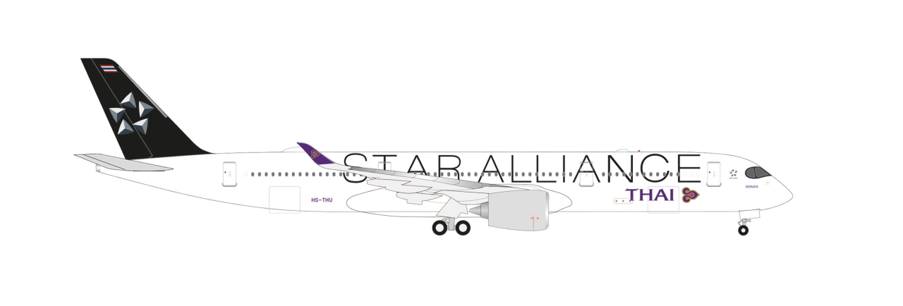 Im Jahr 1997 war Thai Airways eines der fünf Gründungsmitglieder der Star Alliance. Seitdem ist die Allianz auf 25 Mitglieder angewachsen, die zusammen eine Flotte von über 5.000 Flugzeugen betreiben und mehr als 1.300 Ziele in 195 Ländern anfliegen. Um die weltweit grösste Airline-Allianz zu bewerben, ist jedes Mitglied angehalten, mindestens ein Flugzeug in der speziellen Lackierung der Gruppe zu betreiben: mit dem Stern-Logo auf dem Leitwerk und den Titeln im Billboard-Stil auf dem Rumpf als zentrale Elemente. Thai Airways hat diese Lackierung auf zwei Airbus A350-Flugzeuge aufgebracht, von denen eines nun als limitierte Auflage im Massstab 1:500 erscheint.