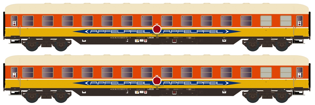 Die IAO baute die Wagen leicht um und lackierte sie in den Hausfarben des Unternehmens. Die Fahrzeuge waren im Fensterbereich orange und unterhalb der Fenster gelb lackiert. Darauf war ein blauer, pfeilförmiger Zierstreifen mit weissem Apfelpfeil-Schriftzug und in der Fahrzeugmitte ein roter Apfel aufgemalt. Da die meisten Reisezugwagen bei der DB zu dieser Zeit grün oder silbern waren, fielen die bunt lackierten Apfelpfeil-Wagen im Bahnverkehr auf.