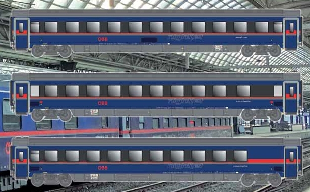 "Nightjet"-Set in der neuen Lackierung, bestehend aus einem Bmz-Wagen 2. Klasse, einem Bcmz-Schlafwagen und einem Bbcmvz-Schlafwagen mit Behindertenabteil