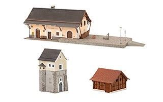 Das Set besteht aus einem Bahnhofsgebäude mit grosser Laderampe, einer Trafostation, einem Toilettenhaus im Lasercutverfahren und diverse Ausschmückungsteile.