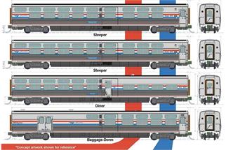 Bestehend aus zwei Viewliner II Sleeper, einem Baggage-Dorm, einem Diner der Amtrak im Phase III-Farbschema. Die Wagen können mit den Kato-Innenbeleuchtungen (Art.-Nr. K11211/2 und K11213/4) ausgerüstet werden.
