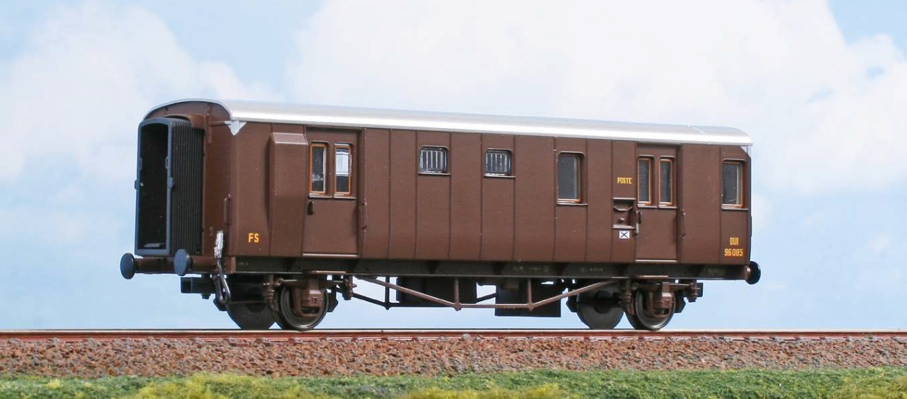 Gepäck- Postwagen der FS DUI 96000 in Braun-Lackierung.