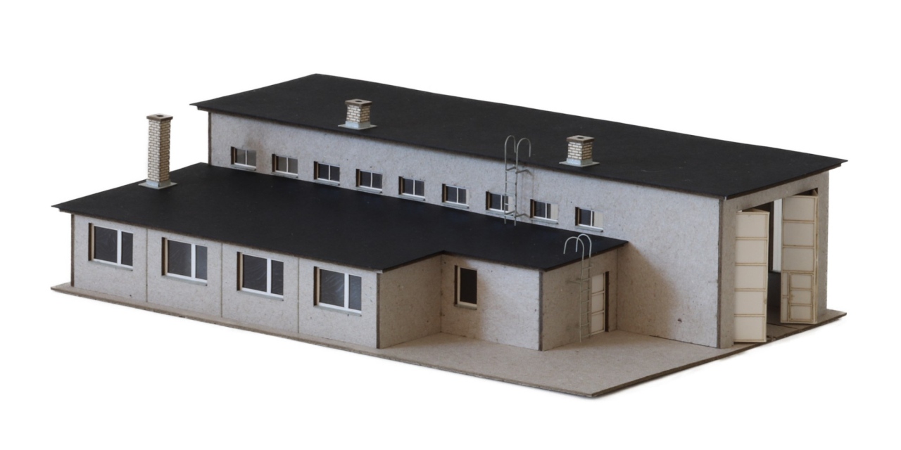 Lokschuppen für Lokomotiven, die in 4 Varianten montiert werden können: ein Bürogebäude links oder rechts, das mit Tor oder Wand endet.