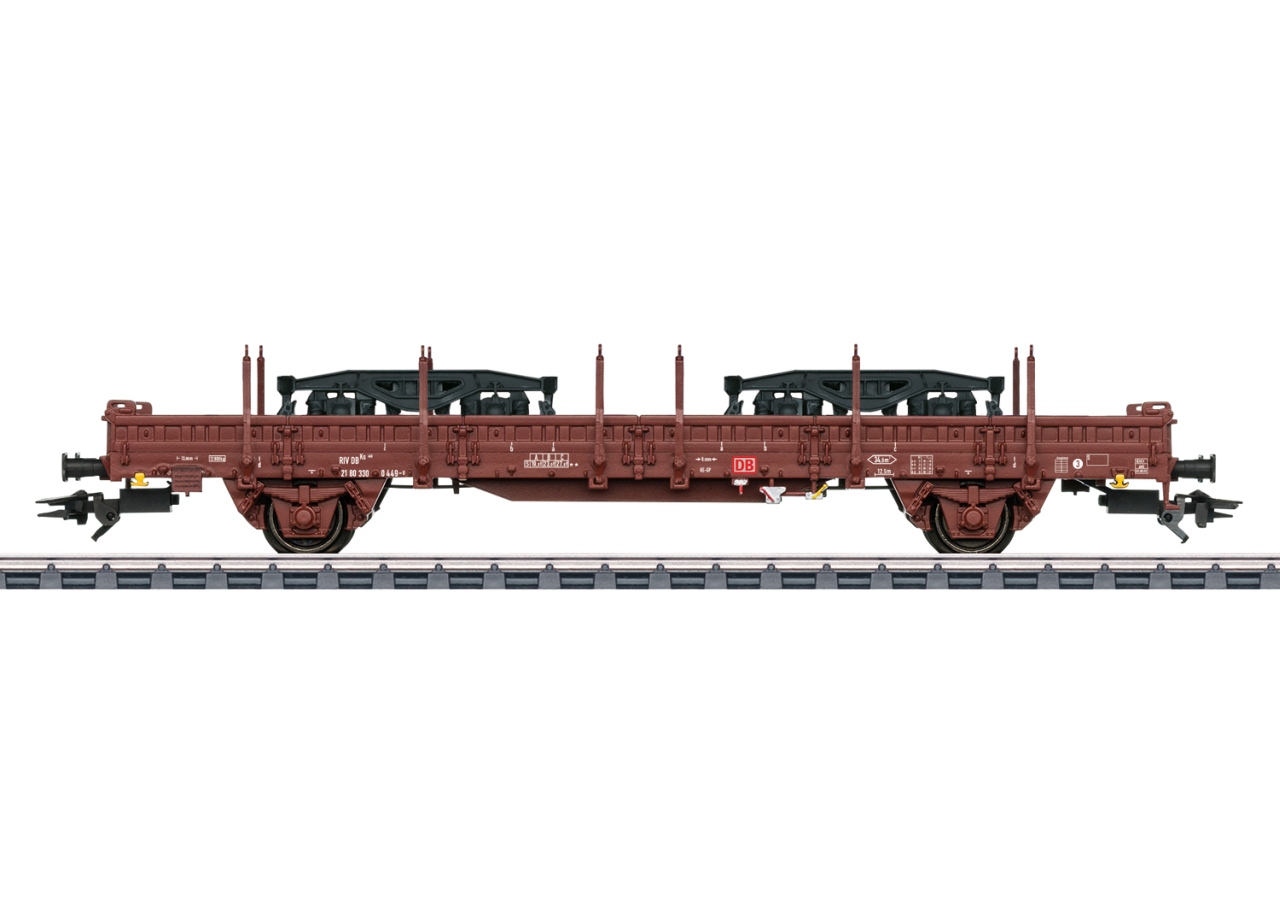 Modell: Ausführung ohne Bremserbühne sowie kurzen Stirnrungen. Mit separat angesetzter Bremsanlage, Bremsbedienelementen und drehbaren Rungen. Ladefläche in Holzbohlenoptik. Stirnseitige Aufnahmen zum Einstecken von beiliegenden Rungen. Pufferhöhe nach NEM. Rechteckige Pufferteller. Ein Ladegestell für die Drehgestelle liegt bei. Länge über Puffer 15,8 cm. Gleichstromradsatz E700580.