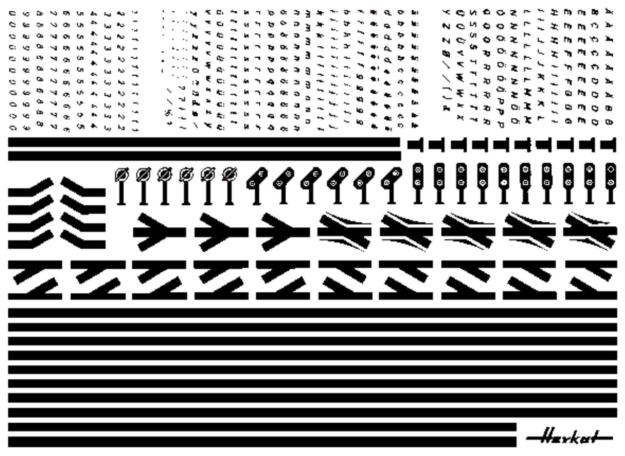 Zum Aufreiben der Gleissymbole auf die Stellpultplatte. Die Symbole haften durch einfaches Anreiben wischfest und dauerhaft auf jeder glatten Unterlage. Mit Buchstaben und Ziffern für Beschriftungen wie z.B. Ein, Aus, Licht, Gleis 1 usw.