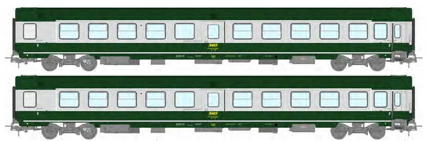 Set mit 2 So-Personenwagen in grün/betongrau, werkseitig mit sichtbaren Drehgestellfedern, gelbes "Encadré"-Logo, Ep. IV