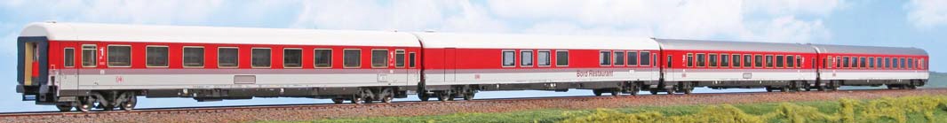 Set bestehend aus einem 1. Klase-Wagen des Typs Avmz107, zwei 2. Klase-Wagen des Typs Bpmz293.2 und einem Speisewagen des Typs WRmz137, alle in Produktfarben.