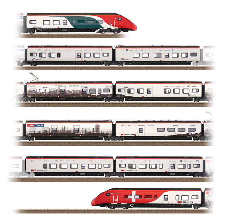 Vorbild: Elektrischer Hochgeschwindigkeits-Triebzug EC 250 als RABe 501 «Giruno» der Schweizerischen Bundesbahnen (SBB). 1 Endwagen A (Bt1), 2. Klasse. 1 Mittelwagen B (B11), 2. Klasse, mit Pantograph. 1 Mittelwagen C (B10), 2. Klasse. 1 Mittelwagen D (B9), 2. Klasse mit Pantograph. 1 Mittelwagen E (B8), 2. Klasse. 1 Mittelwagen F (B7), 2. Klasse, mit behindertengerechten Einstiegen und Pantograph. 1 Mittelwagen G (WR6), mit Restaurant-Bereich. 1 Mittelwagen H (A5), 1. Klasse, mit Behinderten-Einstiegen und Pantograph. 1 Mittelwagen J (A4), 1. Klasse. 1 Mittelwagen K (A3), 1. Klasse. 1 Endwagen L (At2), 1. Klasse. Mit Zulassung auch nach Deutschland und Österreich vorgesehen. Zug-Nummer RABe 501 004. Präsentationszug, mit auffälliger Schweiz/Italien Gestaltung an den Endwagen. Betriebszustand um 2018/19.