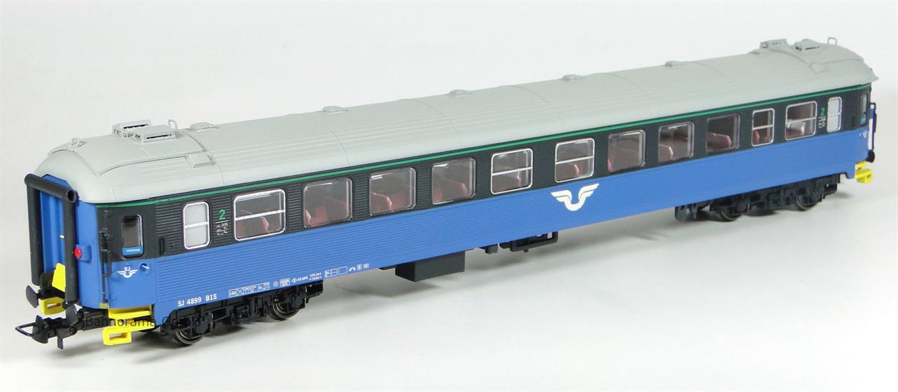 NMJ Topline Modell des SJ Personenwagens Typ B1N 4899 in der blauschwarzen Designausführung, 1. Version. Das Modell weist alle Details an Gehäuse, Dach und Fahrgestell auf. Vorbildgetreue, teilweise handbemalte Inneneinrichtung.