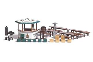 Bausatz für ein komplett ausgestattetes Gartenlokal: Ausschankhäuschen mit Zapfanlage und Werbebedruckung bekannter Biermarken wie Veltins und Ganter. Dazu Bierfass, Smoker, Heizpilz, Brauereigarnituren mit Tischen und Bänken sowie Bierkästen und Flaschen in verschiedenen Farben. Passende Ergänzung: H0 7783 Bierkrüge.