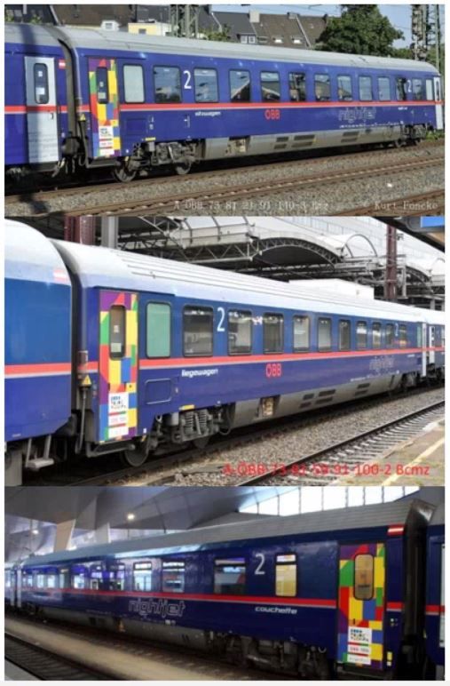 Etwa dreissig Wagen waren mit dieser Lackierung ausgestattet, einige Liegeplätze verschiedener Typen (Bcmz 59-90,0, Bcmz 59-91,1 und Bcmz 59-91,2 modular), einige 2-stöckige Betten Typ WLABmz 76-94,2 und 76-94,3) und die Sitze-Bmz 21-91.1, die noch in der Zusammensetzung der NightJet-Züge verkehren, die Europa und auch Italien in den verschiedenen Zielen verbinden, die mit diesen Nachtzügen erreicht werden (Venedig, Mailand, Florenz, Rom ...)
